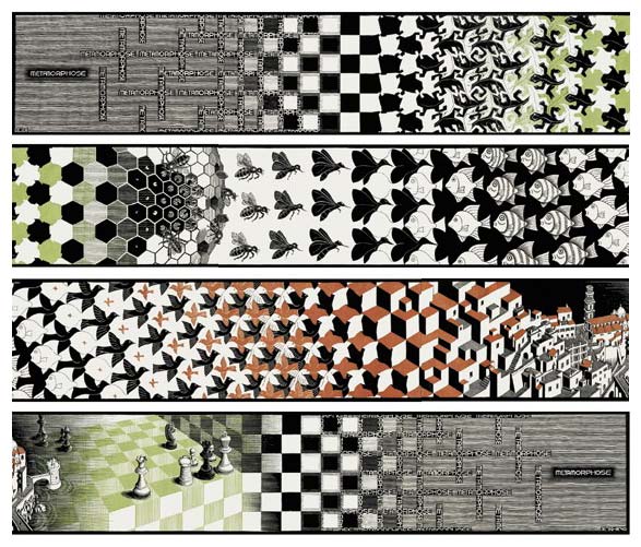 I was especially taken with Reptiles (note the pack of rolling papers!) and Metamorphosis II. For the latter, nothing would do except I had to make the biggest copy ever and tape it to my wall so I could follow it around while high. Later on, I even felt so connected to Escher that as an expression of what I thought was his original intention, I made a printed copy of Metamorphosis II on a Mobius strip to show my sons how it truly went on forever.